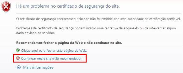 Clique em "Continuar neste site (não recomendado)". Aparecerá a página do nosso site com uma mensagem de "Erro do Certificado" ao lado da barra de endereço.